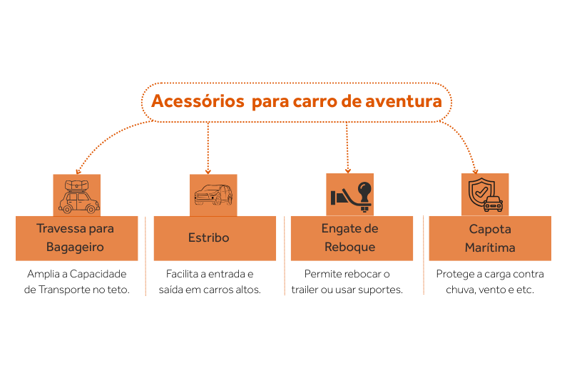 Para viagens em família, acessórios que aumentam conforto e organização são os mais úteis. Itens como estribos, travessas de teto e capotas ajudam no acesso ao veículo e no transporte seguro de bagagens.