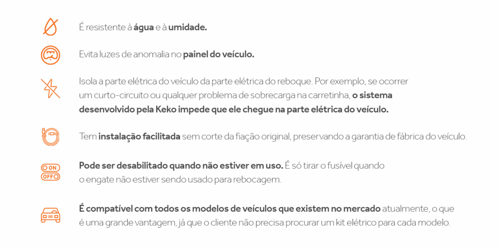É aqui que a Keko entra como sua parceira, com um um kit elétrico completo, com módulo microprocessado que garante o perfeito funcionamento das luzes do reboque sem comprometer a elétrica original do seu carro.