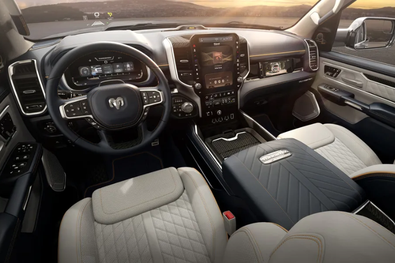 E com cabine Mega Cab com espaço incomparável, o veículo ainda oferece bancos em couro premium com aquecimento/ventilação e Uconnect 12″ com navegação.